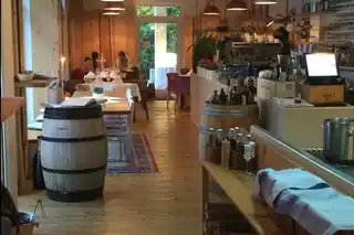Im Innenbereich finden bis zu ca. 70 Gästen Platz, wo die offene Schauküche das Highlight bildet.