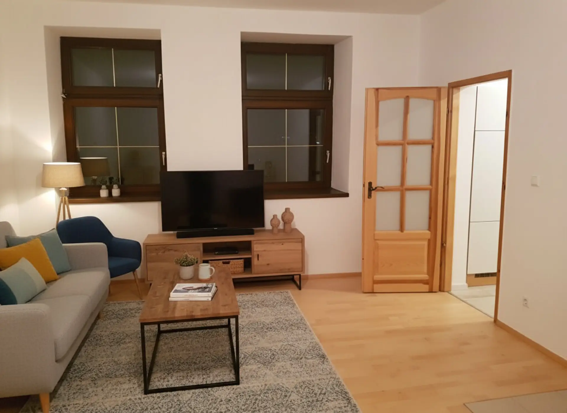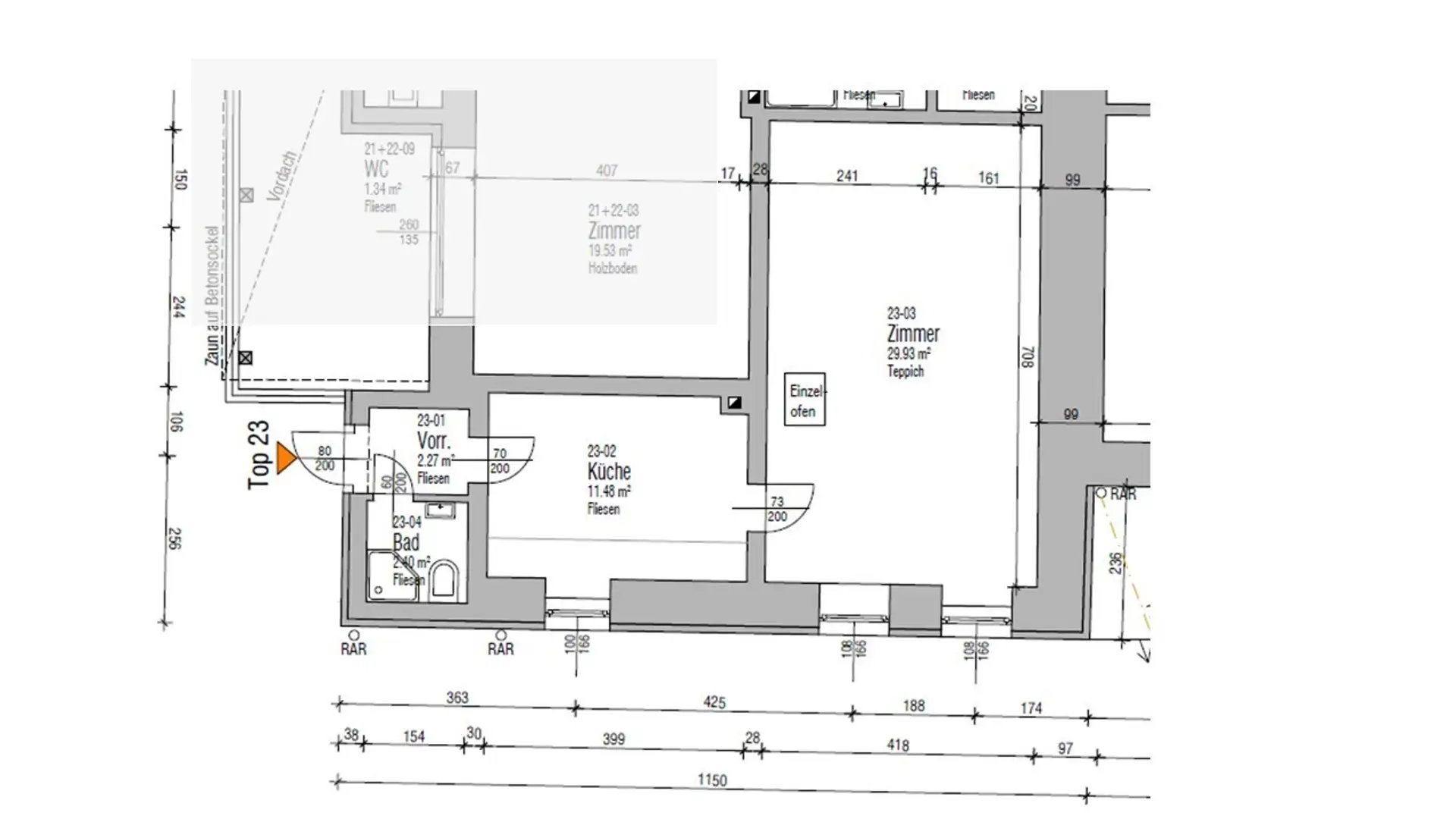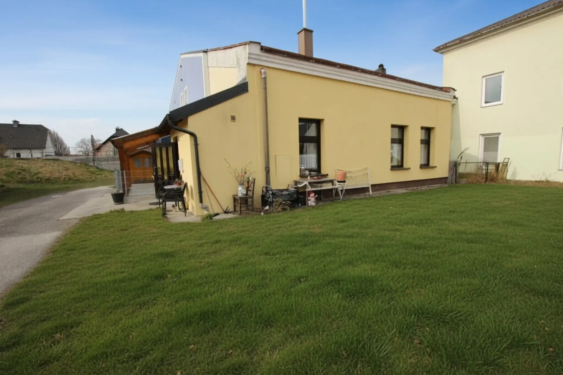 Die Wohnung mit Doppelhauscharakter betritt man durch den Vorraum mit Fußbodenheizung, mit direkten Zugang zur Küche sowie Badezimmer. Rechterhand vom Eingangsbereich, befindet sich das Badezimmer ebenfalls mit Fußbodenheizung inkl. Dusche, Handtuchtrockner und WC. Die angrenzende Küche enthält die notwendigen Geräte und zusätzlich wurde hier noch der Waschmaschinenanschluss integriert. In der Küche gibt es genügend Platz für einen Esstisch und Staukästen. Das ca. 29,03 m² große Wohn- und Schlafzimmer ist mit Holzfußboden und der Möglichkeit eines Zusatzofens ausgestattet. Dieses Zimmer könnte man aufgrund seiner Größe nochmals abtrennen, um ein weiteres Zimmer oder einen abgetrennten Bereich zu erhalten. Die großen Fenster ermöglichen eine angenehme Wohnatmosphäre aufgrund der hellen Räumlichkeiten. Der Wohnraum ist mit einem Parkettboden, die Küche mit einem Melanboden (Fließenlook) ausgestattet und in den restlichen Räumen wurden Fliesen verarbeitet. Neben dem Gebäude gibt es ein Holzhaus, wo sich ein Abstellraum, welches als Lager für Fahrräder, Holz etc. verwendet werden kann. Dieser Abstellraum ist nicht in Eigentum enthalten und wird somit nicht mit verkauft. PKW-Abstellmöglichkeit befindet sich unmittelbar vor dem Gebäude. Zusätzlich gibt es vor dem Haus eine Grünfläche, welche genutzt werden kann.