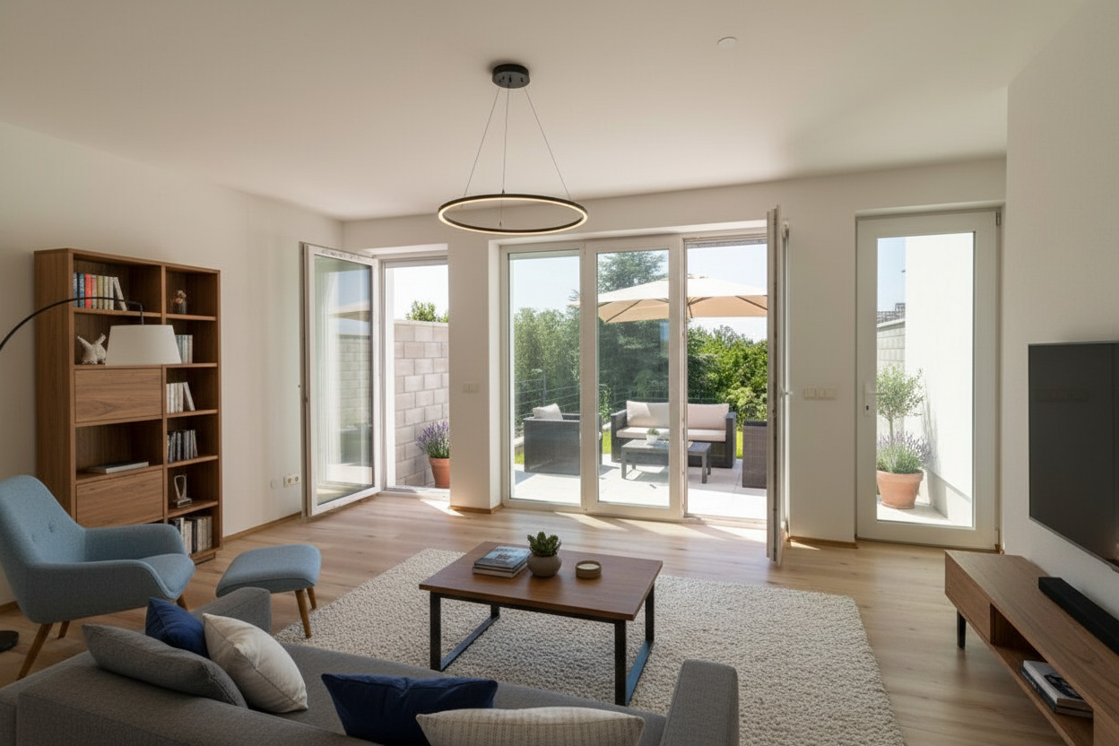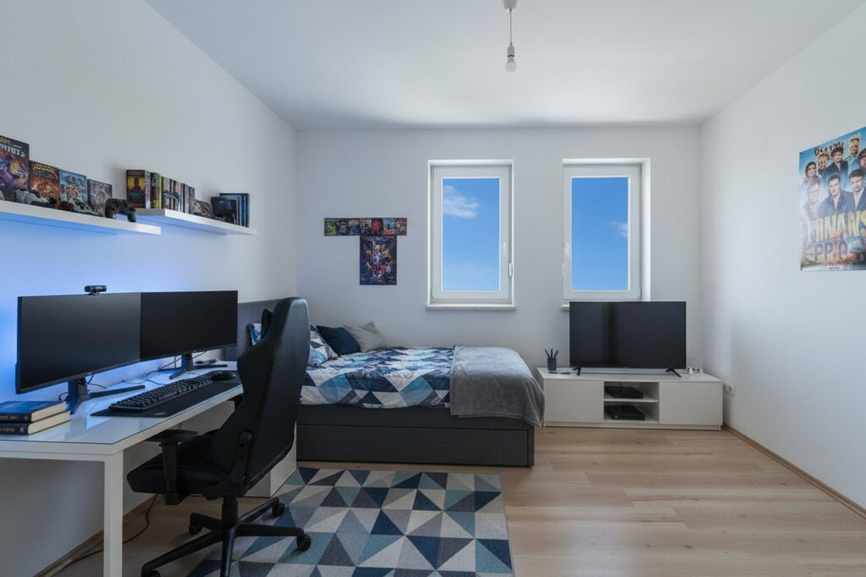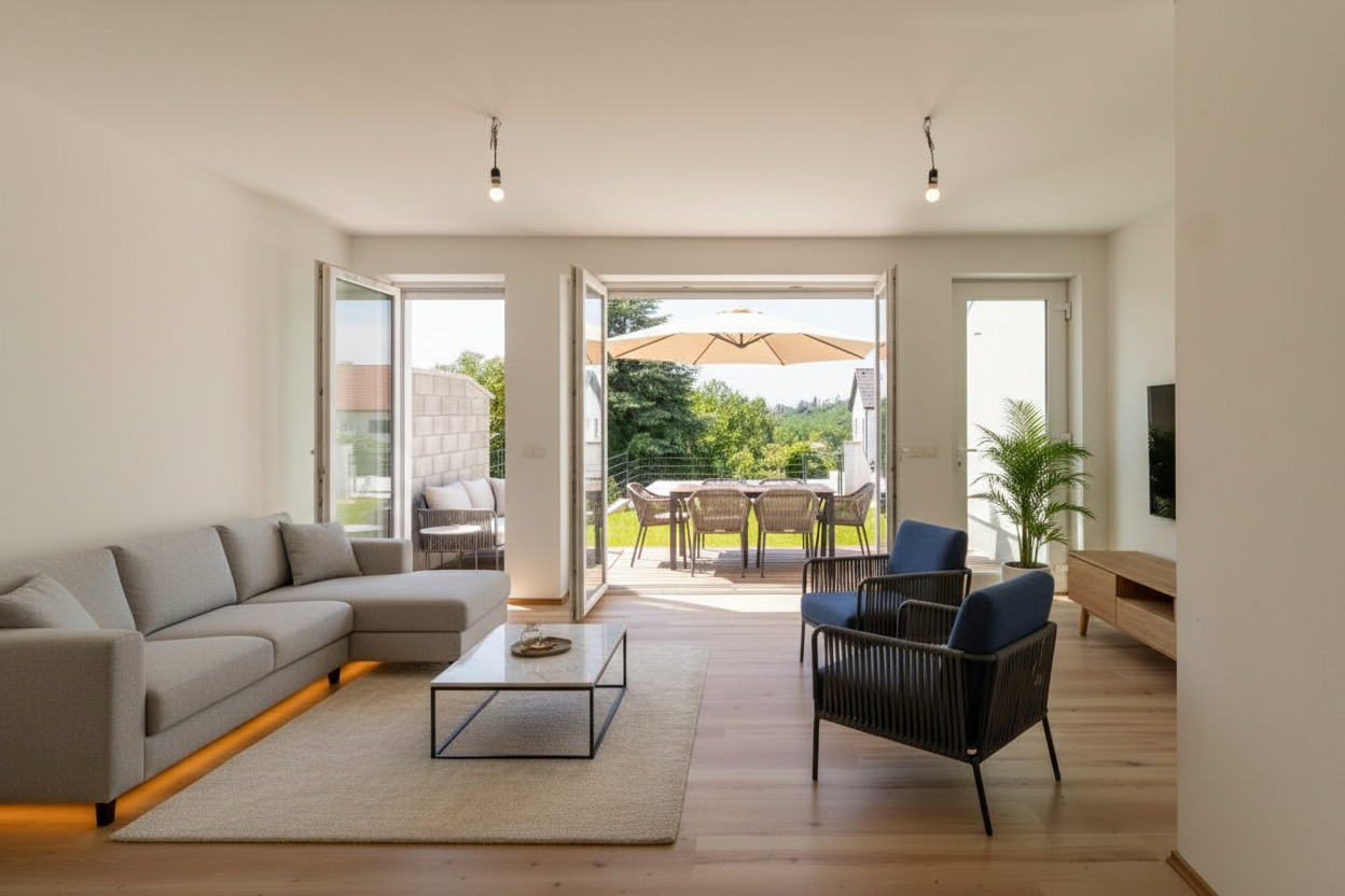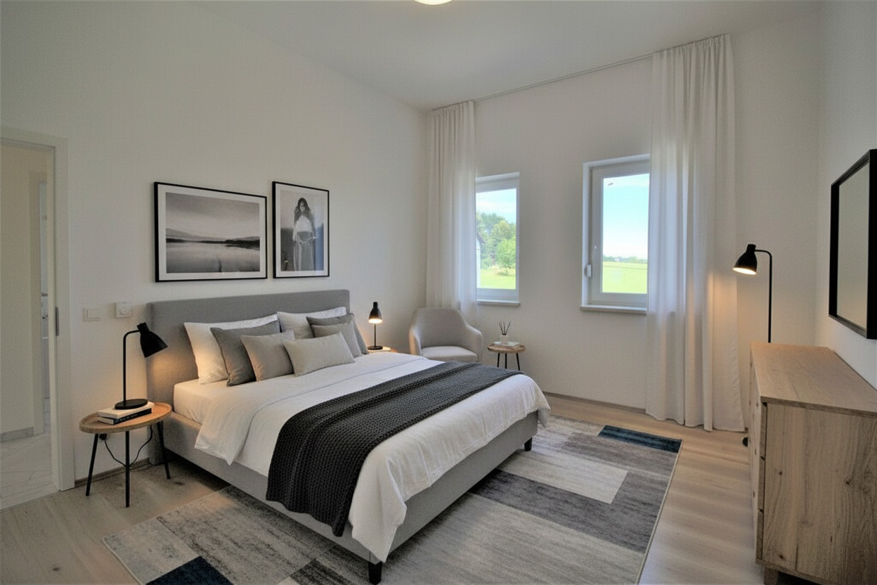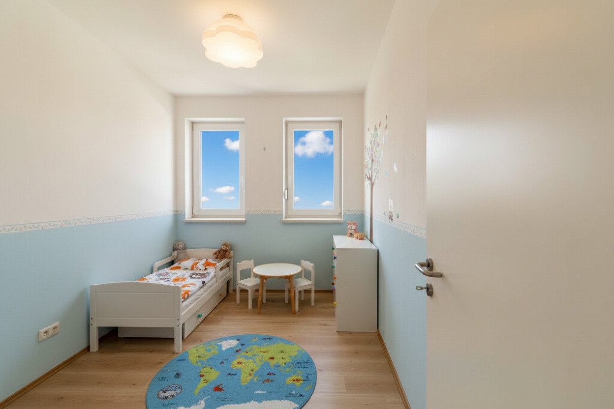 „Die dargestellten Möbel und Einrichtungsgegenstände dienen der besseren räumlichen Vorstellung und wurden mittels KI visualisiert. Sie sind nicht Bestandteil der tatsächlichen Ausstattung der Immobilie.“