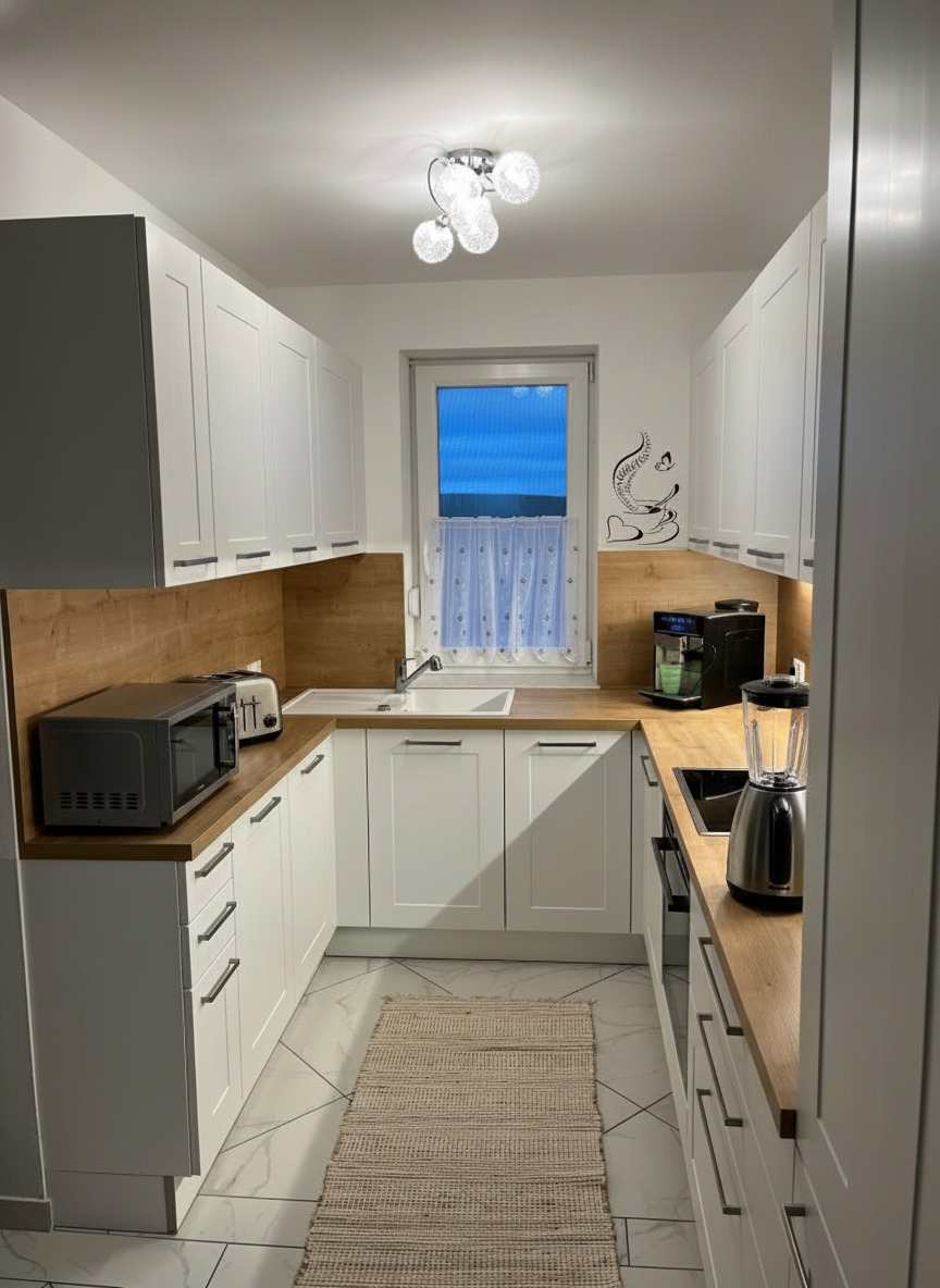 Die Nassräume sind mit, Badewanne, Dusche, Waschbecken, Spiegel- und Unteraschrank und Waschmaschinenanschluss ausgestattet. Am Boden und an den Wänden wurden große Fliesen verlegt. Die Bodenbeläge im Wohnbereich und in den Zimmern sind aus hochwertigem Laminat. Die weißen Innentüren und Türstöcke sind ebenfalls eingebaut.