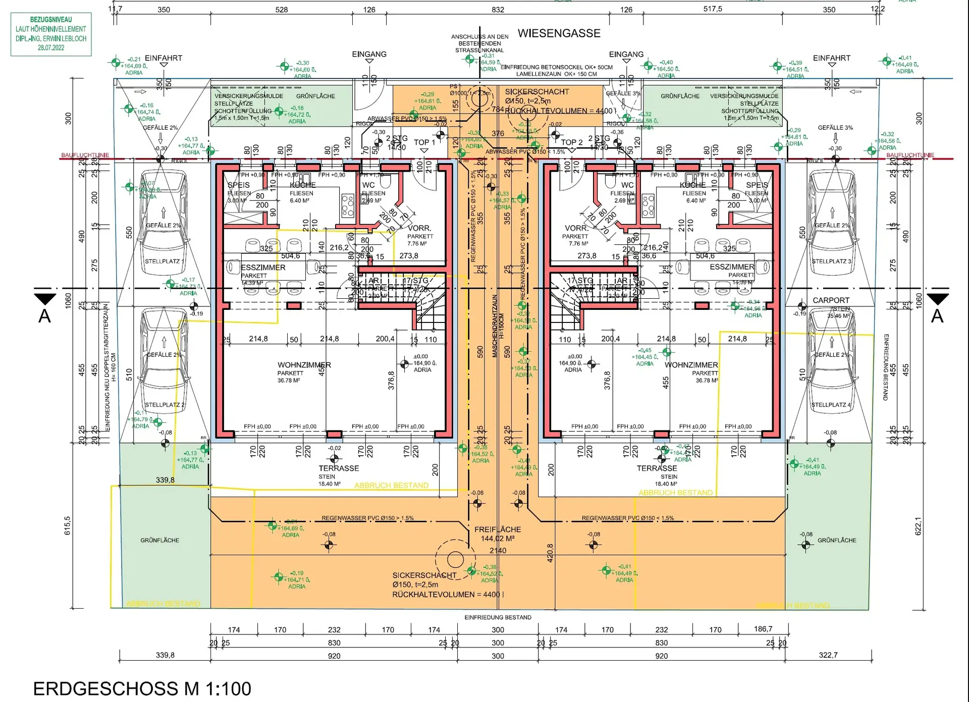 Das Einfamilienhaus liegt in Kapellerfeld, eine Katastralgemeinde von Gerasdorf und ist optimal nach Süden ausgerichtet. Der Eigengrund ist ca. 279,00 m². Die Nutzfläche des Hauses beträgt ca. 201,00 m². Zum Haus gehören zwei KFZ-Stellplätze mit ca. 36,00 m², die durch eine elektrisches Tor von der Straße getrennt sind.