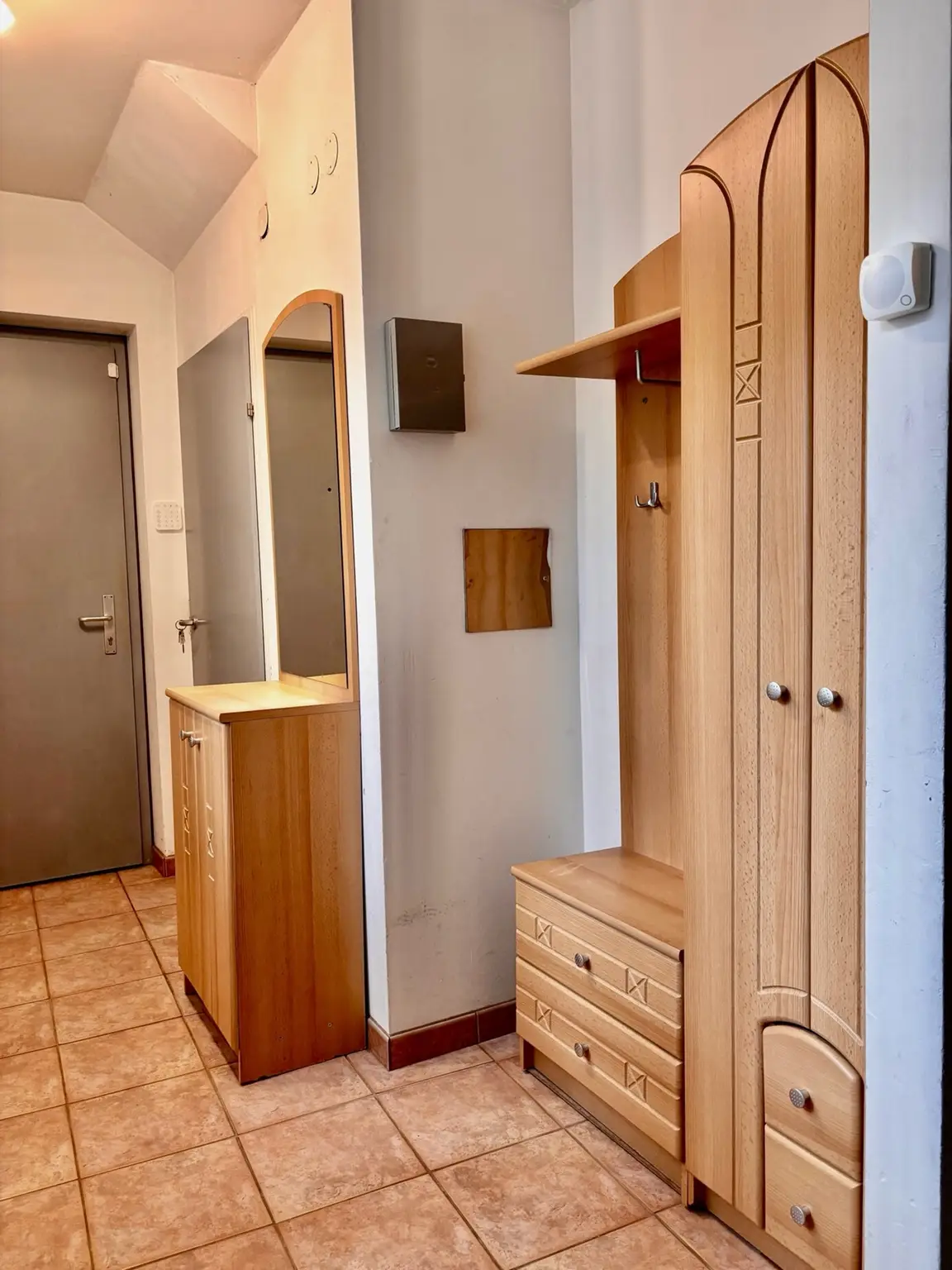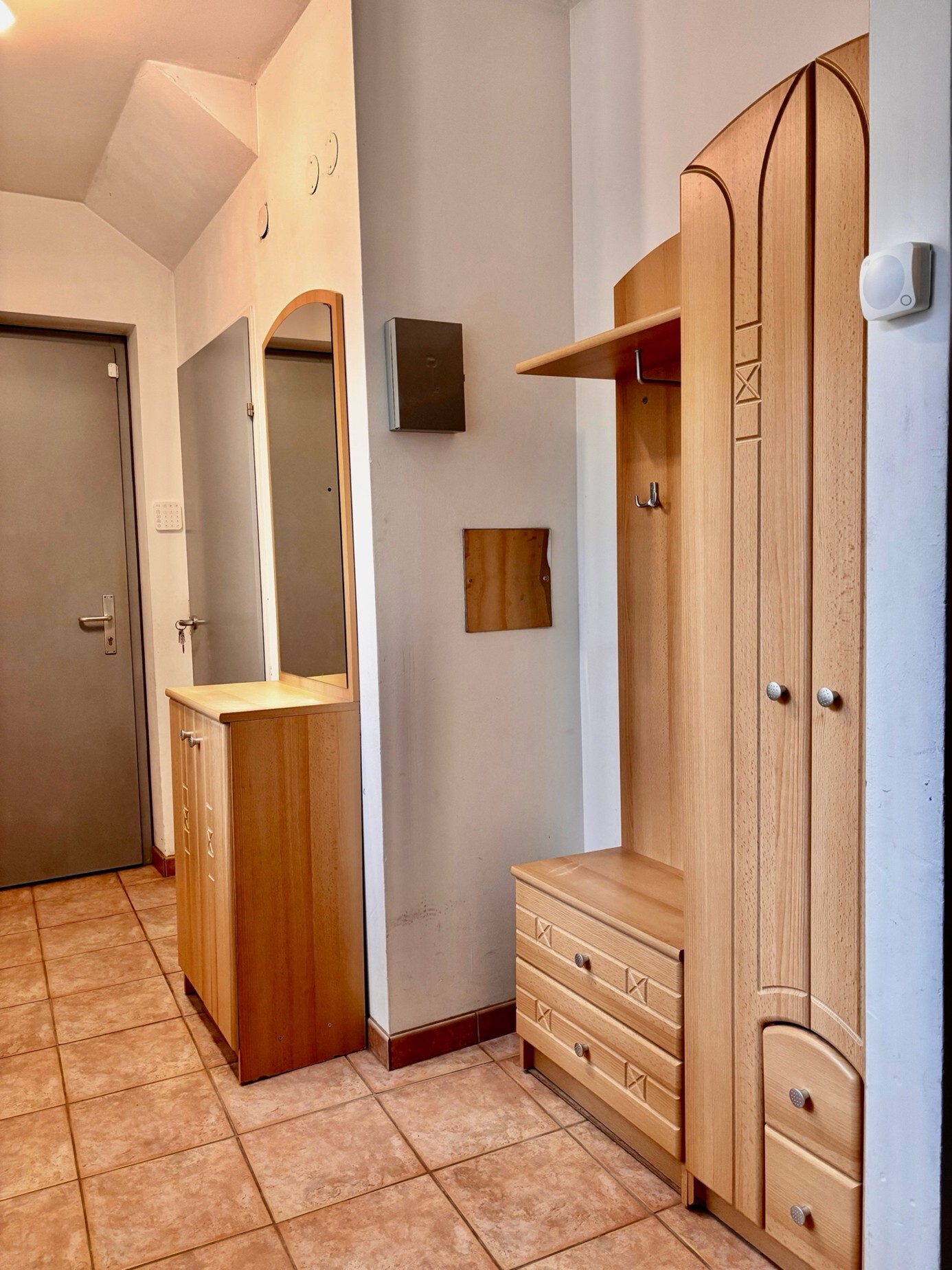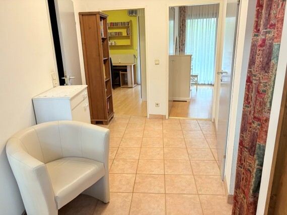 Im Eingangsbereich ist die Türe zum praktischen Abstellraum, weiter gelangt man in das zentrale Vorzimmer. Alle Räume sind von hieraus direkt zu begehen. Das Bad verfügt über eine Badewanne und eine Waschmaschine (bzw. Anschluss). Es gibt idealerweise ein extra WC mit Handwaschbecken. Eine Nische im Vorzimmer bietet weiteren Platz für Stauraum.