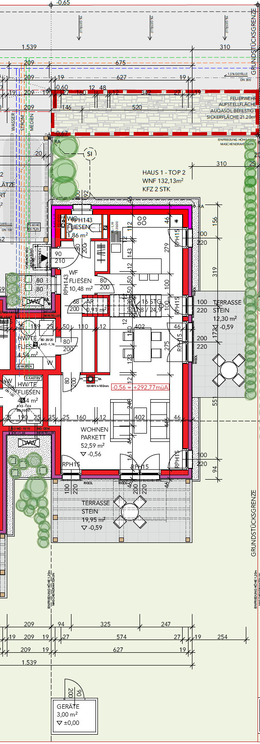 Die Grundstücke wurden über eine neu geschaffene Zufahrtstraße nordöstlich der öffentlichen Leopold Lehnerstraße erschlossen. Jedem Doppelhaus sind nördlich zwei Carports mit je zwei KFZ Abstellplätzen, sowie eine Müllsammelstelle zugeordnet und jede Doppelhaushälfte verfügt über einen großzügigen Eigengarten mit ca. 180 m². In jedem Garten wurde zudem ein praktischer Geräteschuppen mit ca. 3 m² Fläche errichtet.