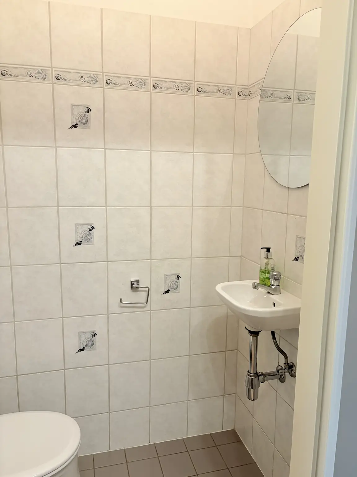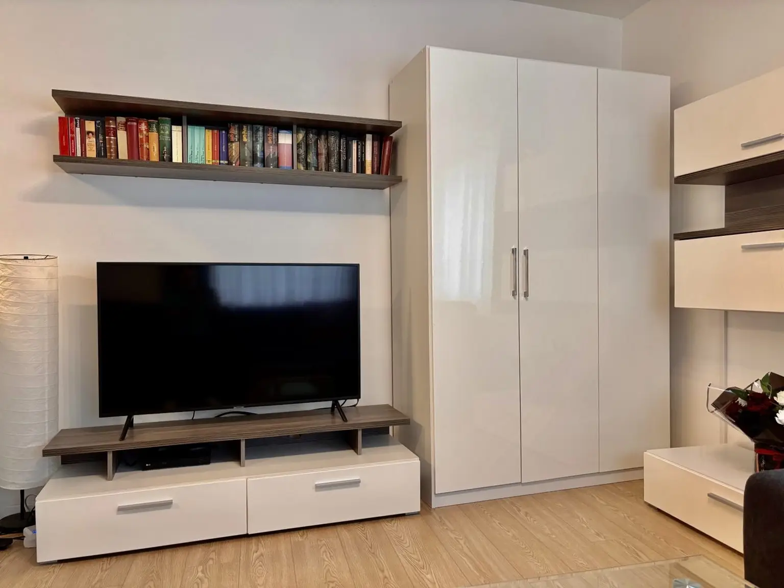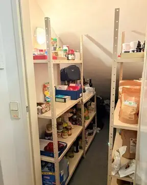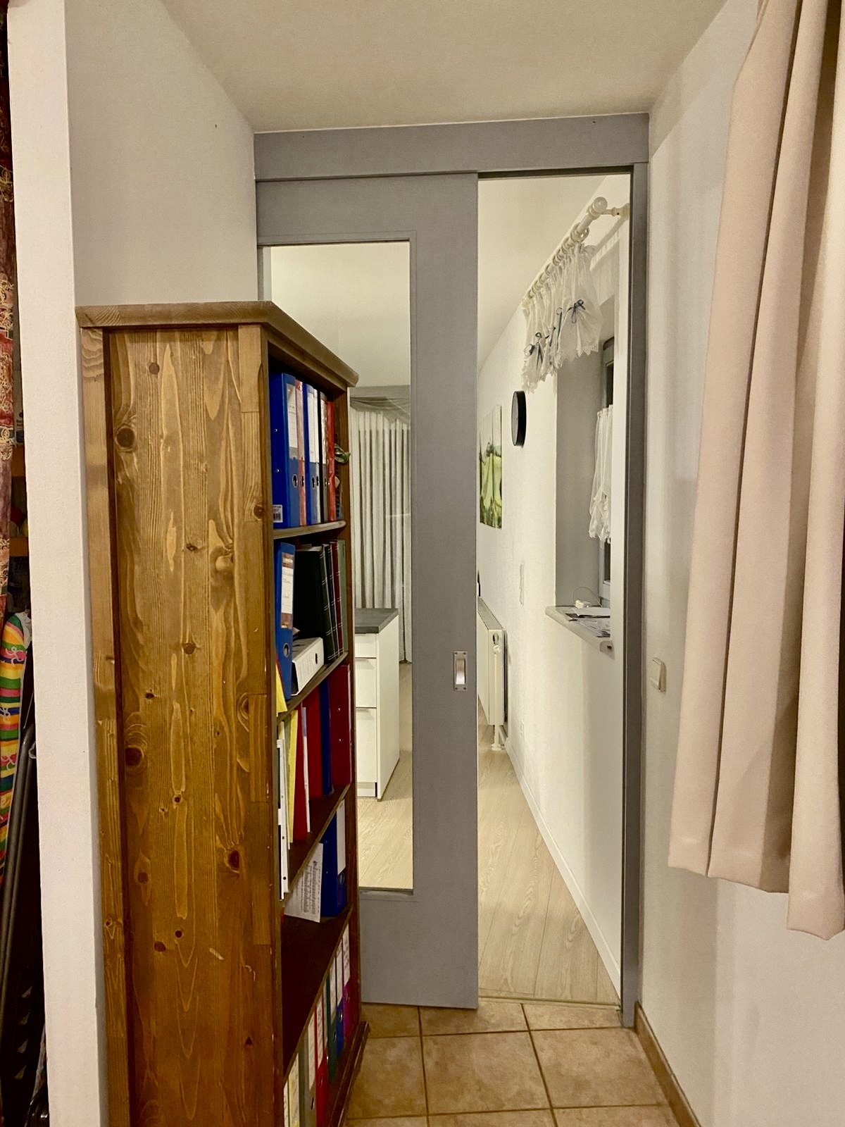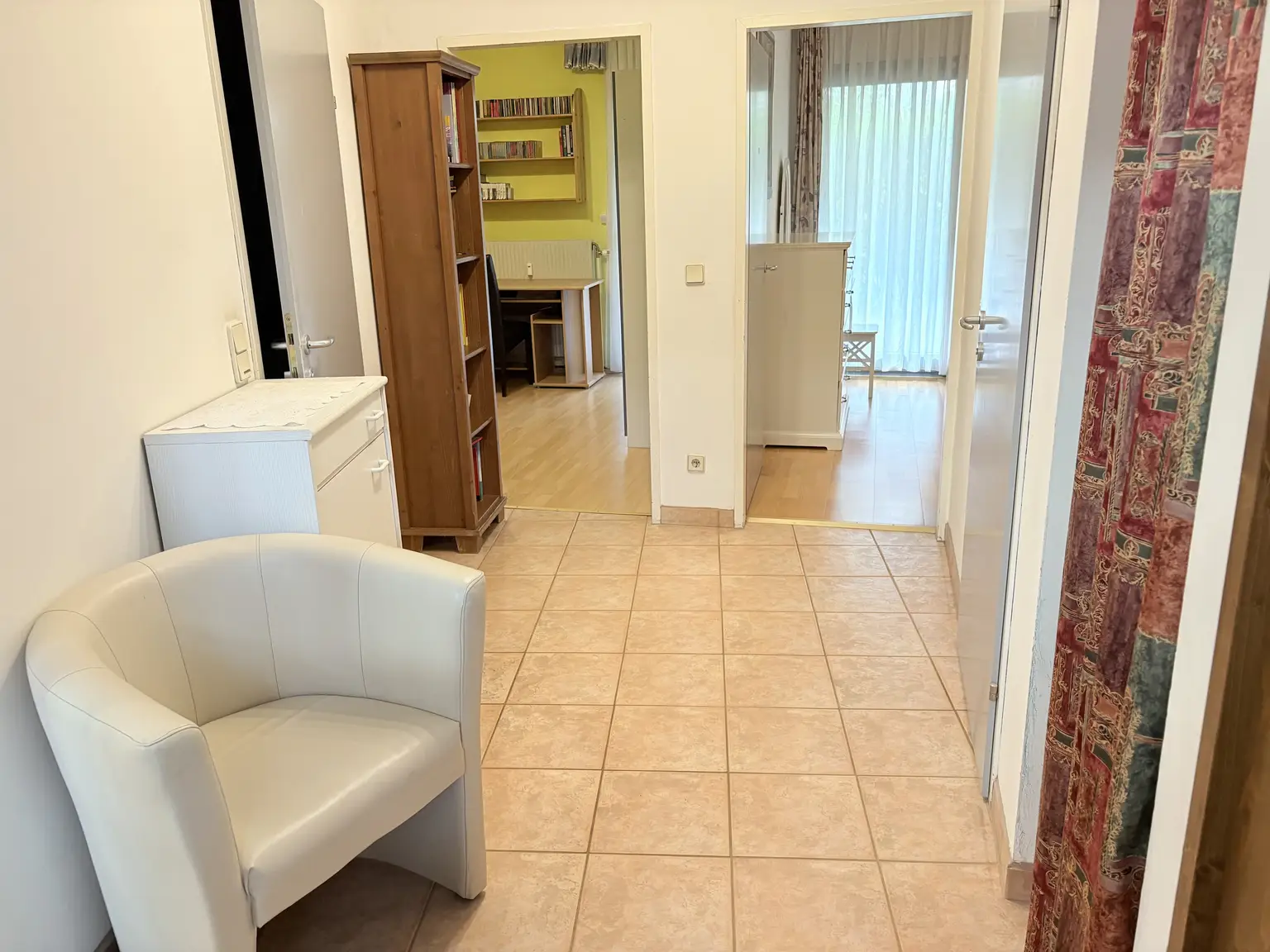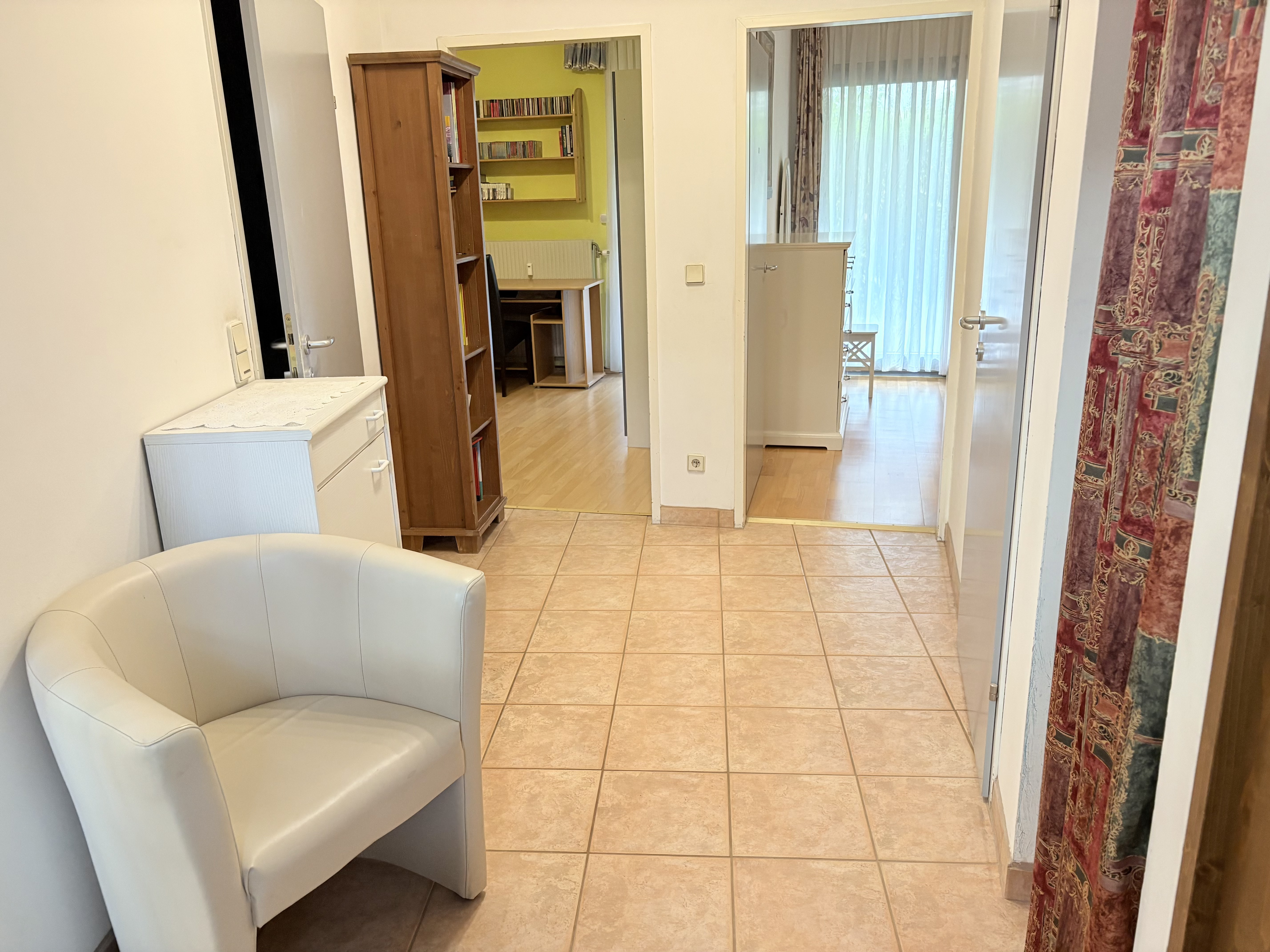 Im Eingangsbereich ist die Türe zum praktischen Abstellraum, weiter gelangt man in das zentrale Vorzimmer. Alle Räume sind von hieraus direkt zu begehen. Das Bad verfügt über eine Badewanne und eine Waschmaschine (bzw. Anschluss). Es gibt idealerweise ein extra WC mit Handwaschbecken. Eine Nische im Vorzimmer bietet weiteren Platz für Stauraum.
