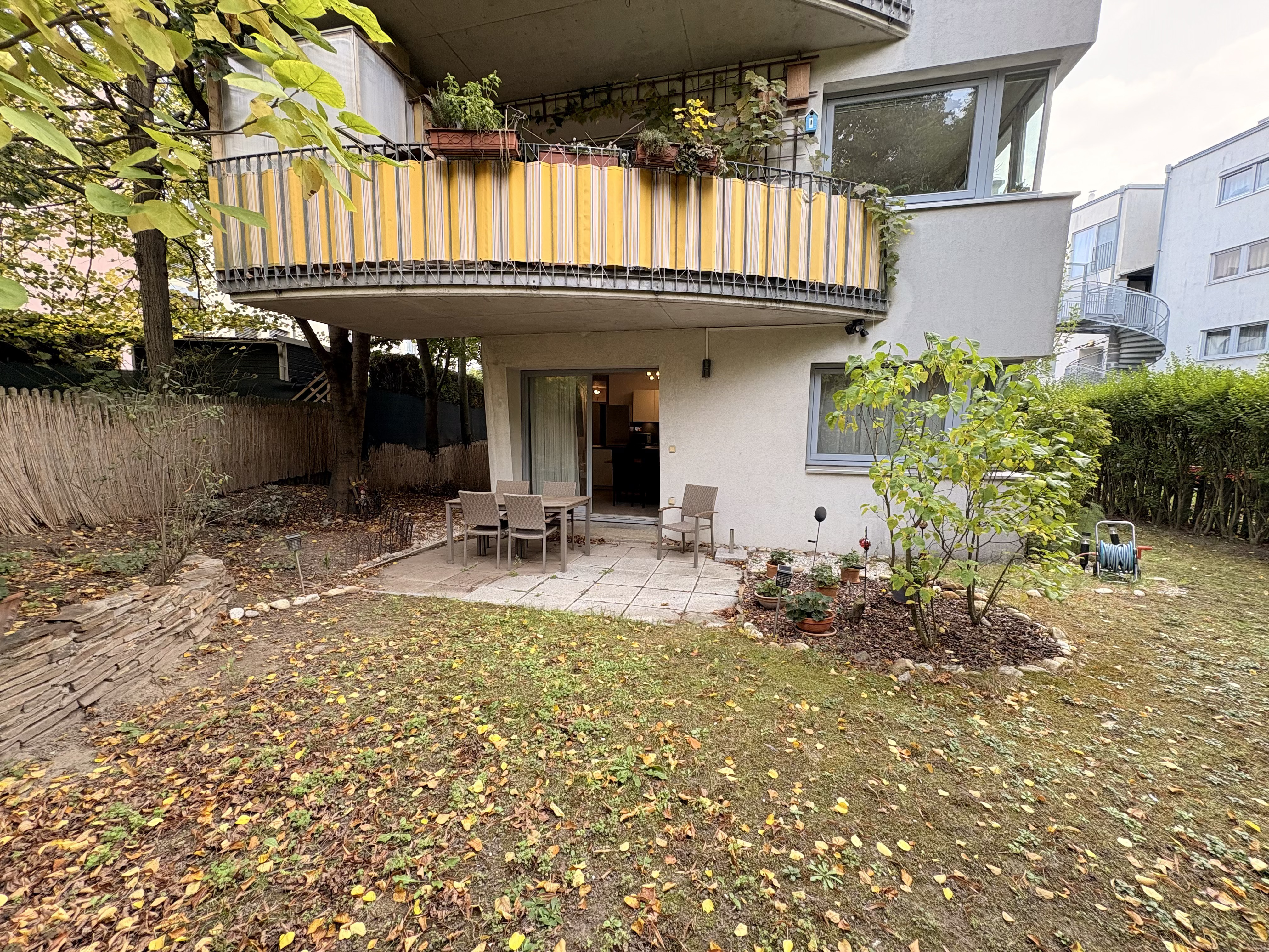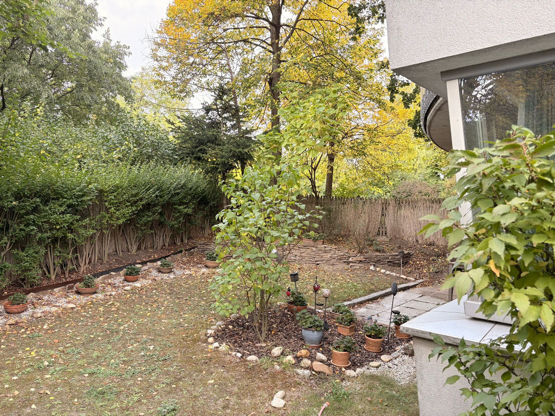 Durch die Ecklage der Wohnung ergibt sich eine charmante, rundum angeordnete Aufteilung des Eigengartens, der den Betrachter zum Betreten und Entspannen einlädt.